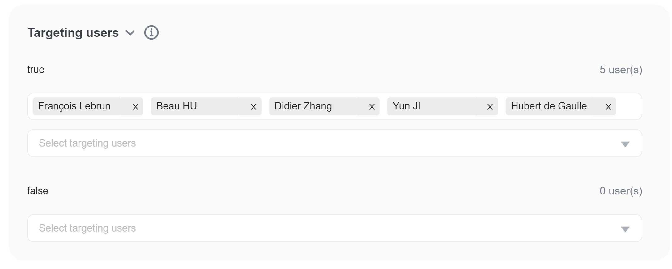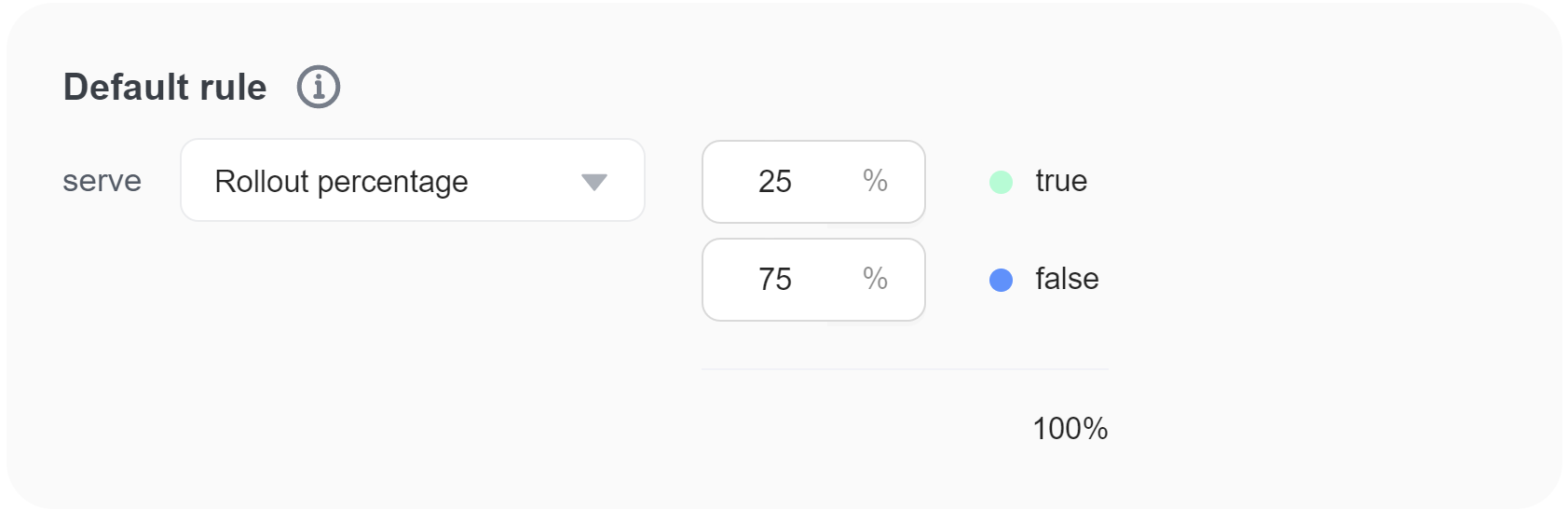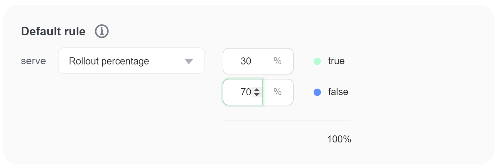 FeatBit defines a final default rule, for any users that don't match any of the targeting rules on the page. As with other rules, you can choose to serve a specific variation, or apply a percentage rollout to any remaining users.