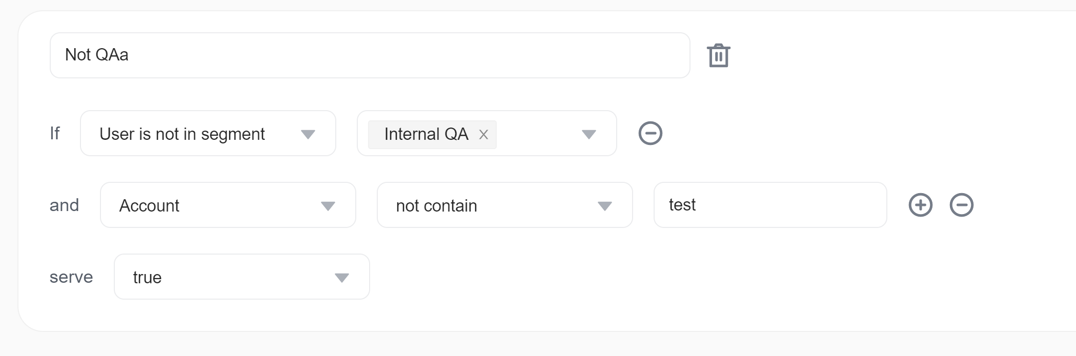 You can use built-in and custom user attributes in flag targeting rules. For example, imagine you want a flag to serve the true variation to users who are not in the segment Test Segment, and whose Account custom attribute does not contain test.