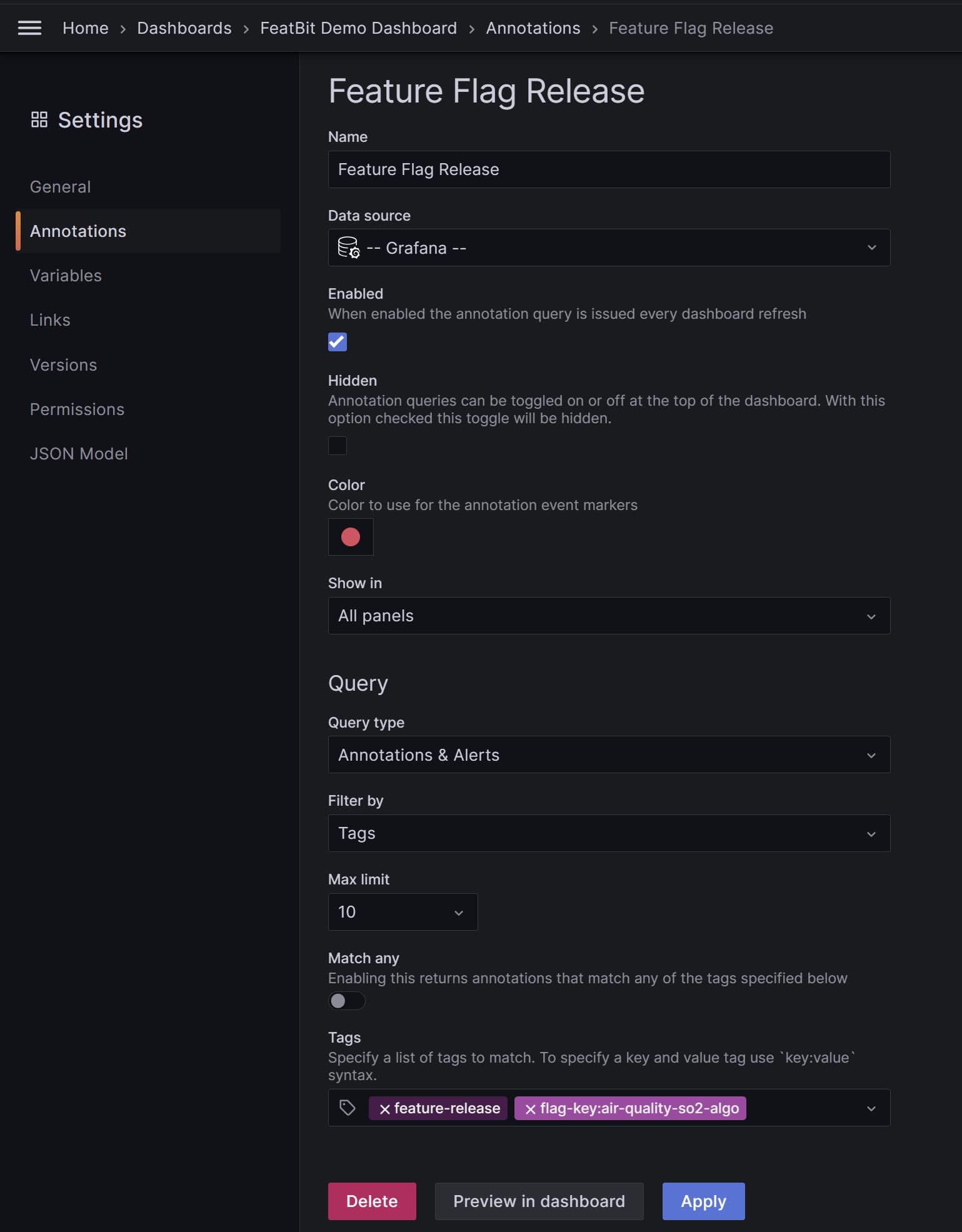 To add FeatBit Webhook events as annotations in Grafana dashboards: